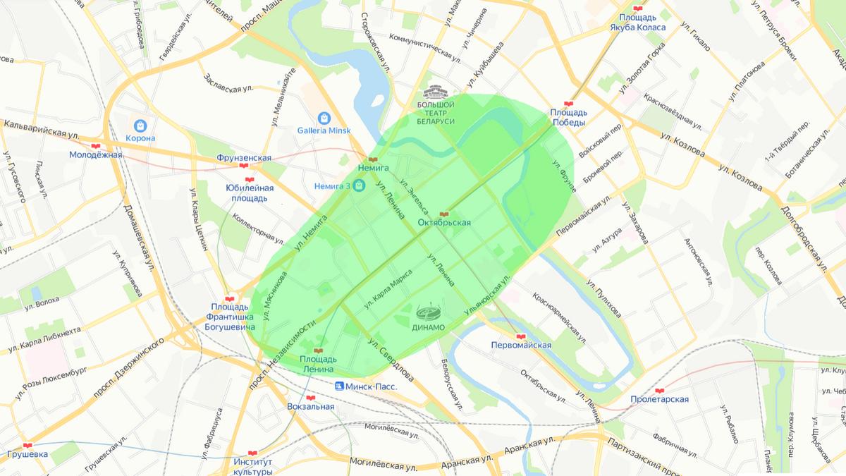 Центр условно находится в прямоугольнике между Немигой и Ульяновской от ж/д вокзала до площади Победы. По середине этого прямоугольника проходит проспект Независимости.